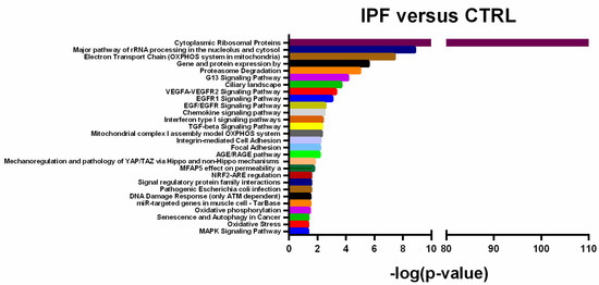 Enriched pathway analysis. Statistically significant pathways regulated by Differentially Expressed (DE) transcripts in Idiopathic Pulmonary Fibrosis (IPF) patients versus Control (CTRL). Fisher’s Exact Test: -Log (p-value) ≥ 1.13.