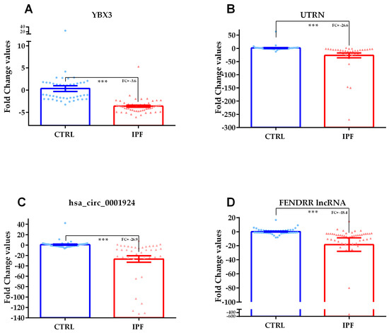 Scatter plots with bars of YBX3 (panel A) and UTRN coding RNAs (panel B), hsa_circ_0001924 circular RNA (panel C) and FENDRR long non-coding RNAs (lncRNA) (Panel D) validated through qPCR in serum samples of IPF patients versus CTRL. The Mann–Whitney U test was used for YBX3 coding RNA that presented a non-parametric distribution, while un-paired t-test was used for all the other transcripts showing parametric distributions. n = 95: 45 CTRL, IPF 50. *** = p-value ≤ 10 × 10−10. FC = Fold Change.