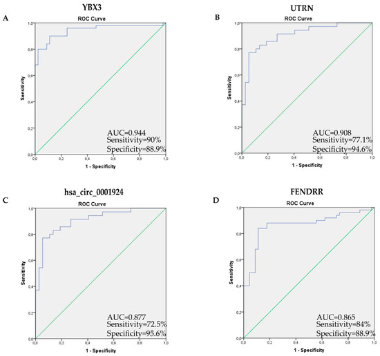 Receiver Operating Characteristic (ROC) curve analysis for predicting YBX3, UTRN, hsa_circ_0001924 and FENDR as IPF patient diagnostic biomarkers with respect to the controls. YBX3 AUC = 0.944 (95%CI = 0.895–0.992 sensitivity = 90%, specificity = 88.9%, p = 1.02 × 10−13) (A); UTRN AUC = 0.908 (95% CI = 0.840–0.976 sensitivity = 77.1%, specificity = 94.6%, p = 2.61 × 10−9) (B); hsa_circ_0001924 AUC = 0.877 (95% CI = 0.800–0.954, sensitivity = 72.5%, specificity = 95.6%, p = 2.38 × 10−9) (C); FEDRR AUC = 0.865 (95%, CI = 0.787–0.943 sensitivity = 84%, specificity = 88.9%, p = 9.39 × 10−10) (D).