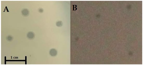 Morphology of plaques of vB_Sen-TO17 (A) and vB_Sen-E22 (B), formed on a lawn of the S. Typhimurium 13 host. A size bar (representing 1 cm) is shown at the bottom of panel A.
