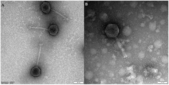 Phages were purified by centrifugation using CsCl (Sigma Aldrich, MO, USA) density gradient as described previously [36]. Transmission electron microscopy analysis of phage capsids was performed in the Laboratory of Electron Microscopy, Faculty of Biology, University of Gdansk, Gdansk, Poland. Virions were negatively stained with uranyl acetate (VWR International Ltd., Radnor, PA, USA) and then micrographs were taken under a Tecnai G2 Spirit BioTWIN electron microscope (FEI, Thermofisher Scientific, OR, USA).
