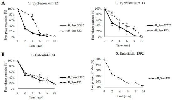 Adsorption rates of phages vB_Sen-TO17 (closed triangles) and vB_Sen-E22 (open triangles) on S. Typhimurium (A) and S. Enteritidis (B) at 42 °C. Number of free phage particles at time 0 was used as reference value (100%). Mean values from three independent experiments are shown, with error bars representing SD. Note that S. Enteritidis 1392 is resistant to vB_Sen-TO17 (Table 2); thus, experiments with this strain were performed only for vB_Sen-E22.