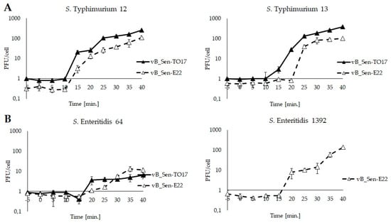 Kinetics of phage development have been investigated in one-step growth experiments. As both phages were isolated from chicken feces and were propagated on S. enterica, these experiments were performed at 42 °C to resemble conditions occurring in chicken intestine. While efficiency of lytic development was different in various host strains, the eclipse period was between 10 and 20 min, and the development was complete within 30–40 min (Figure 4). Burst sizes of Sen-TO17 and vB_Sen-E22 varied between different host strains, ranging from 9 to 79 progeny phages per cell for vB_Sen-TO17 and from 18 to 64 for vB_Sen-E22 (Table 7). These results indicate that lytic development of both vB_Sen-TO17 and vB_Sen-E22 is effective in various S. enterica host strains at 42 °C.