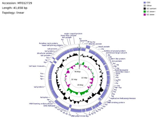 Annotation and sequence analysis was conducted as described previously [21]. Briefly, annotation was based on open reading frame prediction obtained via the RASTtk toolkit [41] and the Prokka suite containing Prodigal [42] where points of difference were settled by analysis of Ribosome Binding Sites (RBS) 4-12 nucleotides upstream of start codons. Putative functions of ORFs were assessed employing the Nucleotide Collection (nr/nt) database with the CDD database [43], 97 Salmonella phage genomes from pVOGs database (http://dmk-brain.ecn.uiowa.edu/pVOGs/, last accessed on 16 November 2020), and the HMMer Reference Proteomes database [44]. Phage-specific promoters were predicted by using the Neural Network Promoter Prediction NNPP method (http://www.fruitfly.org/seq_tools/promoter.html, last accessed on 16 November, 2020). To find Rho-independent terminators in nucleic acid sequences, the Arnold tool was employed [45]. Classification of phages lifestyle was predicted using PHACTS [46]. For phage genome termini analysis, packing mode and topology of viral genomes PhageTerm was employed [47]. To create maps of viral genomes, the CGView Comparison Tool [48] was used, with additional GC skew and GC content analysis. Comparison of genomes of related phages was performed using the EasyFig program (http://mjsull.github.io/Easyfig/files.html, last accessed on 14 August 2020).