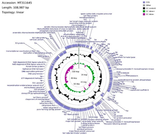The genome of phage vB_Sen-E22 (whole sequence deposited in GenBank; accession no. MT311645) consists of 108,987 bp, with overall GC content of 39.21% and linear topology (Figure 6). Determination of ORFs distinguished 158 putative protein-coding genes where 114 were located on the leading strand and 44 were located on the complementary strand. The frequency of start codons is set out as follows: ATG—147, GTG—8, TTG—3. Among termination codons, nucleotide triplet frequencies were set as follows: TAA—124, TGA—25, TAG—8. The functions of 67 ORFs were assigned, whereas 91 remain hypothetical. ORFs with assigned functions were divided into four functional groups: Morphogenesis (22), DNA packing (10), DNA replication (7), and lysis (2). Morphogenesis CDSs are concentrated inside the region of 46,010–74,545 bps, with nine sequences interspersed throughout the vB_Sen-E22 genome, mainly coding for tail-related proteins with the exception of head assembly proteins vB_SenE22_68 and vB_SenE22_131. CDSs engaged in tail protein assembly dominate this genome region (11 CDSs), whereas two head-related CDSs, coding for portal protein (vB_SenE22_100) and major head protein precursor (vB_SenE22_103), are also present there. Phage head putative genes are located within the 50,510–54,248 bps span which is intersected with the tail fibers protein putative gene (vB_SenE22_101) and the sequence putatively encoding prohead protease (vB_SenE22_102). DNA packing genes are spread across the vB_Sen-E22 genome, and they include genes encoding putative nucleases: Endonucleases (vB_SenE22_99, vB_SenE22_120, vB_SenE22_123, vB_SenE22_153), exonucleases (vB_SenE22_12, vB_SenE22_112), and ribonuclease H (vB_SenE22_158).