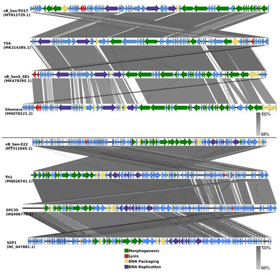 EasyFig output image of the genomic comparison between phages vB_Sen-TO17 and vB_Sen-E22, and the most closely related phages. Phage genomes are presented by linear visualization with coding regions shown as arrows. Selected open reading frames are colored in relation to their functions. The percentage of sequence similarity is indicated by the intensity of the gray color.