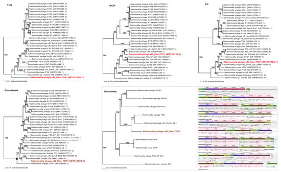 Neighbour-joining phylogenetic trees showing the phylogenetic position of phage vB_Sen-TO17 (in red color) within Cornellvirus based on the sequences coding for terminase large subunit (TLS), major capsid protein (MCP), portal protein (PP), their combined nucleotide sequences (Combined), as well as on the whole-genome analysis (Genomes). The reference sequences were collected from the NCBI database. The tree was constructed using PAUP *. Bootstrap value > 50%, calculated based on 1000 resamplings, is shown above the branches.