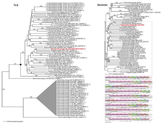 Neighbour-joining phylogenetic tree showing the phylogenetic position of phage vB_Sen-E22 (in red color) within Tequintavirus, based on the sequence coding for terminase large subunit (TLS), as well as on the whole-genome analysis (Genomes). The reference sequences were collected from the NCBI database. The tree was constructed using PAUP *. Bootstrap value > 50%, calculated based on 1000 resamplings, is shown above branches.