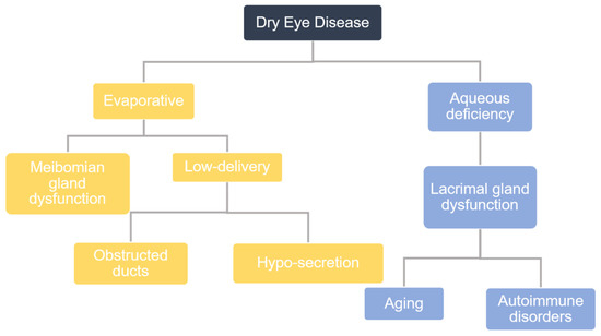In epidemiological studies performed globally, the prevalence of dry eye disease (DED) is estimated to range from 5% to 50%. DED affects 6.8% of the United States adult population (approximately 16.4 million people) and is the most commonly reported condition in eye care clinics [1]. There are primarily two types of DED that are categorized by their etiology: aqueous-deficient DED and evaporative DED (Figure 1). Studies have shown that up to 87% of dry eye patients have evaporative DED, for which the major cause is Meibomian gland dysfunction (MGD). The Meibomian gland is a specialized sebaceous gland, which is embedded in the superior and inferior tarsal plates of the eyelids and produces a lipid secretion called meibum. The action of blinking causes Meibomian glands to secrete meibum, and, thereafter, evenly spreads this meibum across the ocular surface. This thin layer of meibum lies over the aqueous layer, protecting it from evaporation and thereby stabilizing the tear film. The tear film is vital in maintaining corneal homeostasis, nourishing and protecting corneal and conjunctival epithelial cells. Any functional changes to the Meibomian gland that alter its meibum production affect tear film stability, and, ultimately, disturb corneal homeostasis, leading to epithelial damage. Consequently, patients with MGD will report symptoms of eye irritation, such as ocular pain and discomfort, and will also show signs of inflammation [2,3].