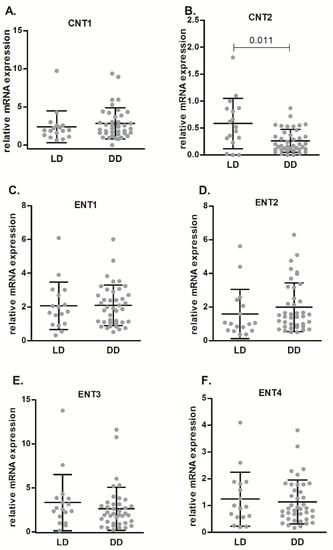 Relative mRNA expression of nucleoside transporters (CNT1 (A), CNT2 (B), ENT1 (C), ENT2 (D), ENT3 (E), and ENT4 (F)), as determined by qPCR analysis, in renal samples from LD and DD. Data are expressed as box-and-whisker plots. p value is shown when comparisons are statistically significant (Mann–Whitney U-test, p < 0.05) between groups. LD, living donors; DD, deceased donors.