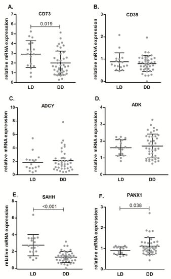 Figure 3 shows gene expression levels of different genes related to purinergic metabolism or ATP release in renal samples from LD and DD. mRNA levels of CD73 (Figure 3A) and S-adenosyl-L-homocysteine hydrolase (SAHH) (Figure 3E) was lower in DD than in LD (p = 0.009 and p < 0.001, respectively), whereas we did not observe any difference in CD39 (Figure 3B), adenylate cyclase (ADCY) (Figure 3C), or adenosine kinase (ADK) (Figure 3D) mRNA expression levels. The hemichannel Panx-1, showed higher mRNA levels in DD samples than in LD samples (p = 0.017) (Figure 3F).