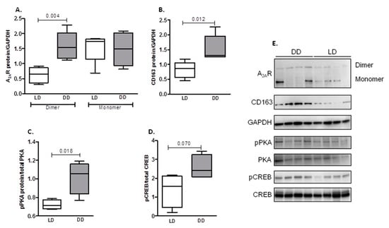 Protein levels were measured in pre-implantation renal tissue of both DD and LD, and these data are summarized in Figure 4. It shows that the expression of the active dimer form ofA2AR (p = 0.004) (Figure 4A), CD163 (p = 0.012) (Figure 4B), and pPKA (p = 0.018) (Figure 4C) proteins was significantly higher in kidney extracts from DD compared with LD samples. Levels of pCREB were also marginally higher in DD, although statistical significance was not reached (p = 0.070) (Figure 4D).