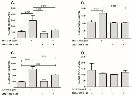 Effect of the A2AR receptor antagonist ZM241385 on CD163 (A) and TGF-β1 (B) gene expression induced by TNF-α in THP-1 cells. Cells were also treated with IL-10 and ZM241385 to evaluate its effect on CD163 (C) and TGF-β1 (D) gene expression. THP-1 cells were treated with ZM241385 (1 µM) 30 min before adding TNF-α (10 ng/mL) or IL-10 (10 ng/mL) for 18 h. Cells were collected, and total RNA was extracted and retrotranscribed to cDNA. Results are expressed as mean ± SD; p value is shown when comparisons are statistically significant (unpaired Student’s t-test, p < 0.05), n = 3 for each point.