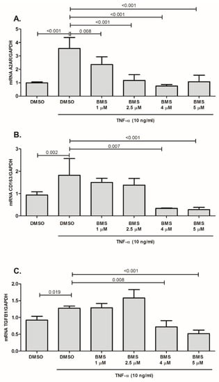 Effect of the NF-κB inhibitor BMS354451 on the A2AR (A), CD163 (B) and TGF-β1 (C) mRNA levels in THP-1 cells stimulated with TNF-α (10 ng/mL). BMS354451 (1, 2.5, 4 and 5 μM) was added to the cells 1 h before cytokine treatment and cultured for 20 h. Results are expressed as mean ± SD; p value is shown when comparisons are statistically significant (unpaired Student’s t-test, p < 0.05), n = 4–8 for each point.