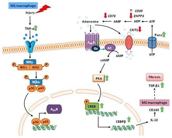 Schematic representation of the proposed mechanism of inflammation/anti-inflammation in DD kidneys. After an injury, such as hypoxia or ischemia, ATP is released and the production of the inflammatory cytokine TNF-α is induced. Via the NF-κB pathway, TNF-α stimulates A2AR expression although the formation and uptake of extracellular adenosine are restricted. Thus, the cAMP-PKA-CREB signaling pathway could be initiated and promote anti-inflammatory immune responses, e.g., through the induction of IL-10 and the switch to the M2 macrophage phenotype (CD163). If injury or inflammation persists, this can lead to the generation of TGF-β1, which may mediate the onset of fibrosis.