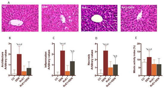 Effect of RvE1 on liver morphology. (A) Representative liver sections stained with hematoxylin-eosin. Scores of livers sections were graphed for (B) architecture, (C) inflammation, (D) necrosis and (E) mitotic activity index (MAI) measured as a percentage of a whole section. At least 20 fields for every sample were analyzed at 400× magnification. n = 6 to 9 animals per experimental group. Asterisk indicates p < 0.05, and the letters identify the experiments that are compared and present this statistical difference. a = control; b = DEN; c = RvE1 and d = RvE1 + DEN.