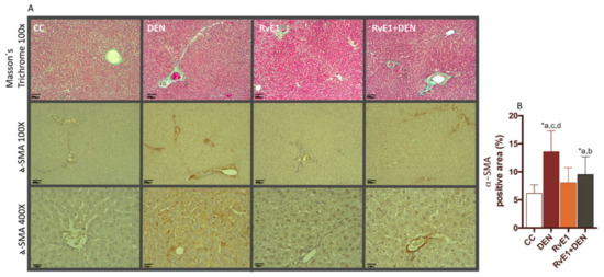 Effect of RvE1 on matrix deposit. (A) Representative histopathological microphotography of liver. Upper panel: Representative Masson´s trichrome. Middle panel: Representative images of α-SMA staining at 100×. Lowe panel: Representative images of α-SMA staining at 400×. (B) Quantification of α-SMA positive areas. At least 20 fields for every sample were analyzed at 400× magnification. n = 6 animals per experimental group. Asterisk indicates p < 0.05, and the letters identify the experiments that are compared and present this statistical difference.