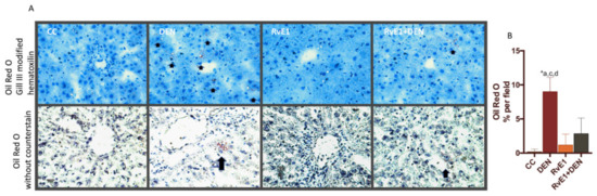 Effect of RvE1 on lipid deposit. (A) Representative histopathological microphotography of liver. Upper panel: Oil Red O plus counterstain Gill III modified hematoxylin. Lower Panel: Oil Red O without counterstain. (B) Quantification of Oil Red O percentage per field. Magnification 400×. At least 20 fields for every sample were analyzed. n = 6 animals per experimental group. Asterisk indicates p < 0.05, and the letters identify the experiments that are compared and present this statistical difference. Arrow indicates the high areas of Oil Red O cumulation.