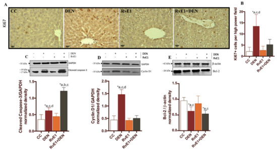 Effect of RvE1 on cell cycle and apoptosis. (A) Representative histopathological microphotography tissue Ki67 at 400× magnification. (B) Quantification of Ki67 positive cell. Western blot analysis of (C) Cleaved caspase-3, (D) Cyclin D1 and (E) BCL-2. The levels were normalized to GAPDH or β-actin as housekeeping. n = 6–9 rats per experimental group. Asterisk indicates p < 0.05, and the letters identify the experiments that are compared and present this statistical difference.