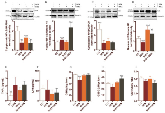 Effect of RvE1 on tissue levels of NF-κB and Nrf2, and molecules targets. Western blot analysis of (A) cytoplasmic and (B) nuclear NF-κB; and (C) cytoplasmic and (D) nuclear Nrf2. The cytoplasmic levels were normalized to GAPDH as housekeeping and nuclear levels were normalized to histone H1 as housekeeping. (E,F) serum levels of TNF-α and IL-10. (G–I) tissue levels of GSH, GSSG and GSH:GSSG ratio. n = 6–9 rats per experimental group. Asterisk indicates p < 0.05, and the letters identify the experiments that are compared and present this statistical difference.