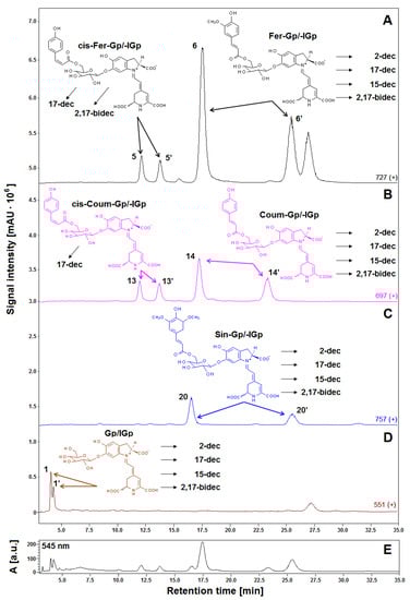 Interpretation of the LC-DAD and LC-MS spectra obtained in the HPLC gradient System 5 revealed that the main products appeared to be mono-decarboxylated derivatives for all gomphrenins due to the loss of CO2 from the corresponding precursors (Figure 4 and Figure 6). Based on previous studies [24], a group of distinct chromatographic peaks with characteristic absorption maxima at λmax 507, 515, 512, and 517 nm, influenced by the bathochromic effect of the acyl substituents, was attributed to 17-decarboxylated derivatives of nonacylated gomphrenins (17-dGp/-dIGp) 2/2′ as well as feruloylated (Fer-17-dGp/-dIGp) 8/8′, coumaroylated (Coum-17-dGp/-dIGp) 14/14′, and sinapoylated gomphrenins (Sin-17-dGp/-dIGp) 21/21′, respectively. Similarly, cis-feruloyl-17-decarboxy-gomphrenin/-isogomphrenin (cis-Fer-17-dGp/-dIGp) 7/7′ and cis-coumaroyl-17-decarboxy-gomphrenin/-isogomphrenin (cis-Coum-17-dGp/-dIGp) 15/15′ were tentatively detected (Table 1) only in undiluted samples due to very low signal intensities (Figure 6).