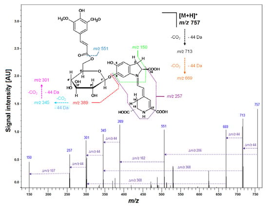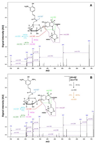 Subsequently, LCMS-IT-TOF analyses yielding m/z 683.2081 (C33H34N2O14, calculated m/z: 683.2083) confirmed the molecular formula of Fer-17-dGp 8 (Table 2). The observed fragmentation pathway in the MS2 mode afforded a signal at m/z 507 (Table 2), indicating detachment of a feruloyl moiety at the glucosyl ring of mono-decarboxylated gomphrenin (683 − 507 = 176 Da). Other daughter ions of Fer-17-dGp 8 detected at m/z 345 and 301 were assigned to mono- and bi-decarboxylated betanidin as a result of further deglycosylation (507 − 345 = 162 Da) and decarboxylation at carbon C-2 or C-15 (345 − 301 = 44 Da), respectively. The full fragmentation pattern is depicted in Figure 7. Likewise, HRMS determination of the molecular formula of C32H32N2O13 for the precursor ion of Coum-17-dGp 16 at m/z 653 supported the presence of a decarboxylated coumaroylated gomphrenin (determined m/z 653.1990; calculated m/z 653.1977). The fragmentation pattern of Coum-17-dGp 16 was analogous to that of Fer-17-dGp 8 and allowed for detection of the detachment of coumaroyl moiety (653 − 507 = 146 Da) from the glucosyl ring of mono-decarboxylated gomphrenin as well as the fragmentation ions at m/z 345 and 301. Fragmentation ions at m/z 507 and 345 were observed for cis-Fer- and cis-Coum-17-dGp (7 and 15). Sin-17-dGp 21 exhibited a precursor ion [M + H] + at m/z 713 and its molecular formula, C34H36N2O15, was obtained in HRMS analyses (determined m/z 713.2205; calculated m/z 713.2188). Its fragmentation pathway was analogous to the previously described Fer-17-dGp 8 as well as Coum-17-dGp 16, and it was presented in Figure 4. Detection of a fragmentation ion at m/z 507 supported the presence of Sin-17-dGp 21 (713 − 507 = 206 Da).