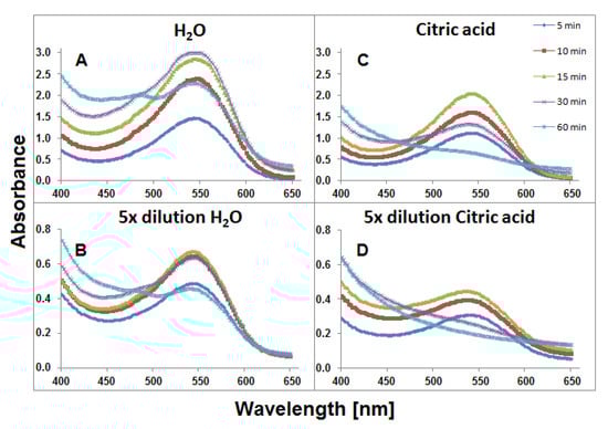 For 0.94 g or 0.19 g weighted portions of G. globosa flowers which were brewing in 6 mL of water for 60 min, two series of solutions were obtained, nondiluted, and fivefold diluted, respectively. The temperature (90 °C) of the tea brewing process was high enough for monitoring changes in the compositions of the resulting mixtures and close to home tea brewing conditions. The spectra of the visible range of the obtained extract samples collected during heat processing are shown in Figure 3. Higher absorbance values were observed for the samples which were extracted in aqueous solutions (Figure 3A,B) in comparison to aqueous citric acid solutions. It indicates mild extraction conditions of gomphrenins in water without citric acid addition. A stronger influence of citric acid addition on the stability of these compounds can be observed in Figure 3C,D. After 60 min, for undiluted samples, the absorption maximum was not clearly observed and there was no absorption band for diluted samples after 30 min.