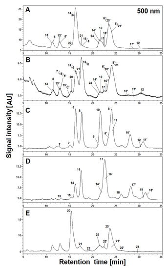 For the aim of selective generation of simplified profiles of acylated gomphrenin derivatives for clear referencing of complex mixtures obtained during the tea brewing study, other heating experiments were performed on purified diastereomers isolated from G. globosa extract. These selected pigments were heated for 10–20 min at 90 °C only in aqueous citric acid solutions which were sufficient for providing clear comprehensive profiles of the referential derivatives and enabled finding the absorption maxima for most of the relevant chromatographically studied compounds. In a few cases, some derivatives generated in the model experiments were not detected in the tea brewing products. Selected chromatograms of the reaction mixtures obtained by heating of purified acylated gomphrenins registered at λ 500 nm are depicted in Figure 4C–E.