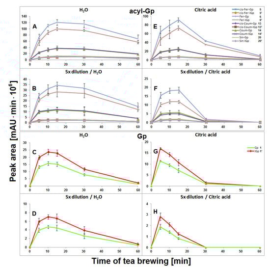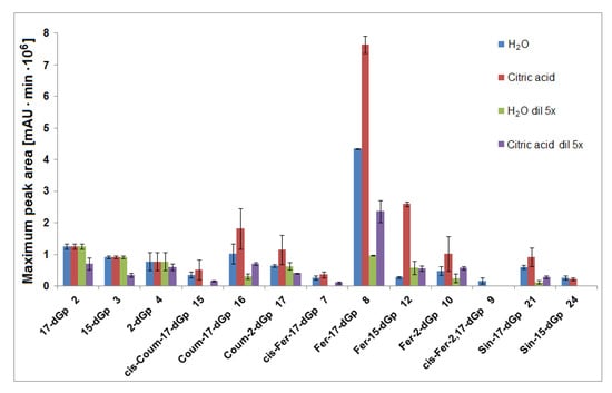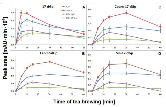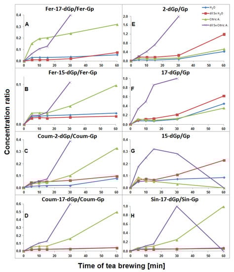 Similarly to aqueous tea samples, the pairs of diastereomers of Fer-, Coum- and Sin-17-dGp/-IGp (8/8′, 16/16′, 21/21′, respectively) were detected in citric acid tea infusions. An increase of their concentrations was observed during the first 30 min in the undiluted samples (Figure 8B–D) with a subsequent slight decline, in contrast to their precursors (Figure 5E). A similar effect was observed for diluted samples, however, in that case, the decline was observed after the first 15 min of tea brewing (Figure 8B–D). Interestingly, cis-Fer-17-dGp 7 and cis-Coum-17-dG 15 were detected both in undiluted and diluted citric acid samples, whereas these compounds were not present in diluted aqueous samples (Figure 6). For Fer-17-dGp 8 (Figure 9A) and Coum-17-dGp 16 (Figure 9D), a very strong increase of their time-dependent CR values in all samples extracted in citric acid solutions was observed. An increase of the CR ratio for Sin-17-dGp 21 (Figure 9H) could be observed during the heating of citric acid undiluted samples, whereas in diluted samples, an increase of the ratio was noticed until 30 min, with a subsequent decrease at 60 min. These changes were not observed in aqueous solutions because natural gomphrenins were more stable which resulted in low and steady CR ratios. For 17-dGp 2 (Figure 9F), an increase of the CR ratio was observed during the heating of the diluted samples. Other detected mono-decarboxylated derivatives, 17 and 12, were assigned to Coum-2-dGp and Fer-15-dGp, respectively. Their concentration profiles were the same as for Coum-17-dGp 16 and Fer-17-dGp 8, respectively, for undiluted and diluted samples (Figure 8C). For Coum-2-dGp 17 (Figure 9C) and Fer-15-dGp 12 (Figure 9B), very similar signal CR ratios were observed to the CR for Coum-17-dGp 16 (Figure 9D) and Fer-17-dGp 8 (Figure 9F). Fer-2-dIGp 10′ (m/z 683) was detected (Table 1), while this compound was not observed in aqueous samples (data not shown). The maximum signal intensity for 15-dGp 12 was observed after 5 min and 15 min of heating in undiluted and diluted aqueous solutions of citric acid, respectively. The Signal of Sin-15-dGp 24 started diminishing after 30 min and 15 min for undiluted and diluted samples, respectively (Figure 8D). The CR ratios obtained for 17-dGp 2 and 2-dGp 4 (Figure 9F and Figure 9E, respectively) increased faster than the ratios for the acylated derivatives for all diluted samples. In contrast, 15-dGp 3 (Figure 9G) was the most labile and was not present in citric acid solutions after 60 min of heating.