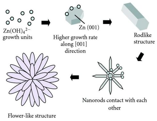 | ZnO | ~103 (length of nanorods) | Nanoflower formed by self-assembly of rods | Microwave-assited hydrothermal | Escherichia coli | 1250 | [27] |