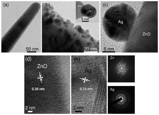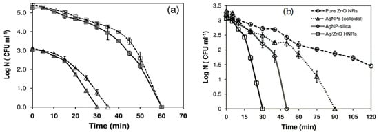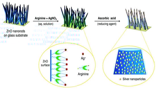 | 7.7%AgNPs/ZnO | 103 (length) of ZnO nanorods | Dispersion of AgNPs on ZnO nanorods | Microwave-assited solvothermal & deposition | Escherichia coli | 40 | [115] |
