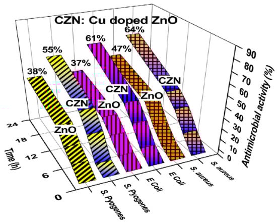 | 5%Cu/ZnO | 250–350 (diameter); 60–80 (thickness) | Prismatic nanoplates | Hydrothermal | Escherichia coli | 72 | [28] |