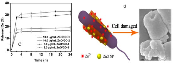 | GO/ZnO | ZnO: 170 | Dispersion of ZnO NPs on GO sheet | Solution mixing | Escherichia coli | 6.25 | [240] |