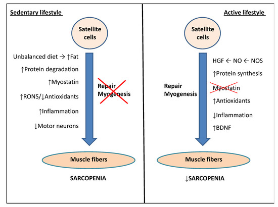 - Clow, C.; Jasmin, B.J. Brain-derived neurotrophic factor regulates satellite cell differentiation and skeletal muscle regeneration. Mol. Biol. Cell 2010, 21, 2182–2190. [Google Scholar] [CrossRef]