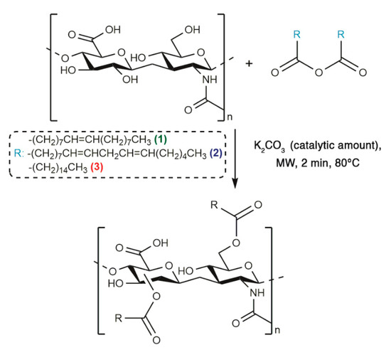 - Calce, E.; Mercurio, F.A.; Leone, M.; Saviano, M.; De Luca, S. Eco-friendly microwave-assisted protocol to prepare hyaluronan-fatty acid conjugates and to induce their self-assembly process. Carbohydr. Polym. 2016, 143, 84–89. [Google Scholar]