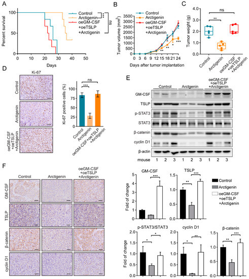Arctigenin inhibits breast cancer progression via decreasing GM-CSF and TSLP in vivo. (A) Kaplan–Meier survival curves for mice injected with the indicated 4T1 cells and/or treated with arctigenin. oe, overexpression. n = 6 mice/group. *** p < 0.01, ns, not significant, p > 0.05 (Log Rank test). (B) The tumor volume of 4T1 tumors separated from mice of each group. (C) The tumor weight of separated 4T1 tumors in each group. (D) Representative Ki-67 staining (left panel) and statistics (right panel) of 4T1 tumors from the indicated mice. Scale bar, 100 μm. (E) The levels of GM-CSF, TSLP, p-STAT3, STAT3, β-catenin and cyclin D1 of the indicated tumors from representative mice were analyzed by Western blotting analysis. Mouse number was indicated at bottom. (F) Representative immunohistological staining of GM-CSF, TSLP, β-catenin and cyclin D1 in the indicated tumor sections. Scale bar, 100 μm. For (B)–(D) (right panel) and (E), the data are shown as mean ± SD. Statistically significant differences are indicated: * p < 0.05, ** p < 0.01, *** p < 0.001, ns, not significant, and p > 0.05 (One-way ANOVA).