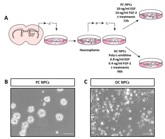 - Vescovi, A.; Reynolds, B.; Fraser, D.; Weiss, S. bFGF Regulates the Proliferative Fate of Unipotent (Neuronal) and Bipotent (Neuronal/Astroglial) EGF-generated CNS Progenitor Cells. Neuron 1993, 11. [Google Scholar] [CrossRef]
