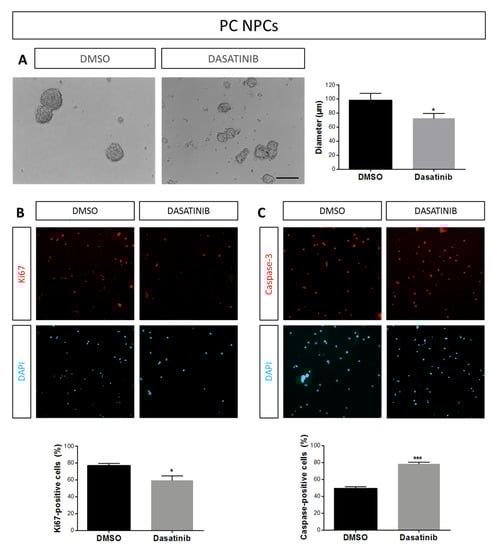 4.4. Analysis of Neurosphere Size, Proliferation, and Apoptosis in PC NPCs