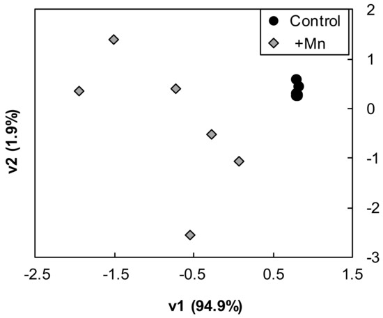 Score scatter PCA (Principal Component Analysis) plot of the Mn-excess treated samples when compared to the controls. PCA was carried out using SPSS Statistical software (v. 24.0) and included proteins showing statistically significant changes (ANOVA, p ≤ 0.05) when compared to the controls. Black dots and grey diamonds depict control and Mn-treated samples, respectively.
