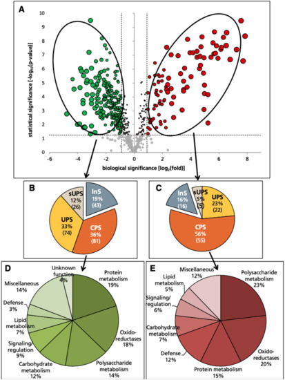 Among the 224 proteins decreasing in relative abundance (dark green dots in Figure 2A; Table S3), 181 (81%) were classified as secretory (including 81 CPS, 74 UPS and 26 sUPS; Figure 2B). The remaining 43 proteins were in the lnS group and were excluded from the biological interpretation, since they could originate from cytoplasmic contamination from neighboring cells. The most highly represented classes based on GO biological process in these secretory proteins (CPS + UPS + sUPS) were protein metabolism (18%), oxido-reductases (18%) and polysaccharide metabolism (14%), followed by carbohydrate (12%), signaling/regulation (9%), lipid metabolism (7%) and defense (3%) (Figure 2D). Decreases in abundance were generally moderate (83% of them ranging between 50 and 80%), with only 23 proteins, scattered among the different metabolic classes, decreasing more than 90% as a result of excess Mn (Table 3).