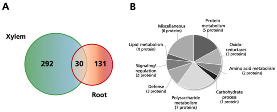 (A) Venn diagram comparing the number of proteins changing as a result of excess Mn in roots and xylem sap of tomato plants (ANOVA, p ≤ 0.05), identified and quantified with at least two peptides, and above the threshold level (fold change ≥2 or ≤0.5). (B) Functional classification of the common proteins (30) showing changes in xylem and root samples of plants grown with excess Mn.