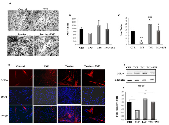 Taurine counteracts the Tumor Necrosis Factor α (TNF)-dependent effect on myogenic differentiation. (A) Morphological analysis of L6 cell differentiation evaluated by May-Grunwald Giemsa staining after 7 days of the indicated treatments. (B) Diagram showing the total number of nuclei (fused and unfused) per microscopic field in control, TNF-, taurine-, and TNF + taurine-treated cells. (C) Diagram showing the ratio between the numbers of nuclei present in myotubes versus the total number of nuclei per microscopic field, expressed as the percentage of fusion. Each experimental point represented in the graphs is the mean ± SD of the counts from three independent experiments. (D) Immunofluorescence analysis of L6 cells shows Myosin Heavy Chain (MHC) (MF20) expression in the cultures treated as described above (original magnification × 20). (E) Western Blotting of the MHC (MF20) expression performed after 3 days of the indicated treatments. A representative blot is shown. (F) Densitometric analyses performed by using anti-alpha-tubulin antibody to verify equal loading of the samples. Statistical analysis was performed using Student’s t-test *# p < 0.05; ** p < 0.01; ### p < 0.001. For Figure 1C * vs. Control, # vs. TNF.