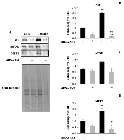 One of the major pathways that have been shown to have a prominent role in increased protein synthesis associated with muscle differentiation/hypertrophy is the PI3K/Akt signaling [34,35]. To verify the involvement of PI3K/Akt signaling in the taurine effect on myogenic differentiation, we used a genetic approach, i.d. Akt1 silencing by transiently transfected L6 cells with siRNA against Akt1. Western blot analysis demonstrates that the strong upregulation of Akt expression observed in taurine treated samples is dramatically downregulated by the Akt ablation (Figure 2A,B). Moreover, since mTOR and MEF2 proteins are implicated as downstream targets of PI3K/Akt signaling as key factors in the control of muscle gene expression, we analyzed by Western Blotting their protein expression in the same conditions. Figure 2A,C,D show that both mTOR and MEF2 are upregulated in the vehicle-transfected taurine treated cells while the silencing of Akt1 is associated with a profound reduction in their expression levels. These results suggest that the Akt signaling network is crucial for myoblast differentiation induced by taurine.