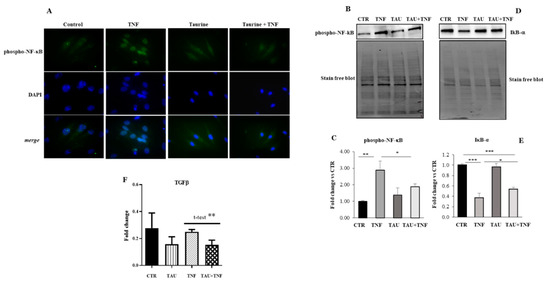 Taurine counteracts the TNF-dependent activation of NF-kB and TGFβ expression. (A) Immunofluorescence analysis of L6 cells demonstrates that taurine down-regulates the high levels of phospho-NF-κB expression induced by TNF (Original magnification × 20). (B,D) Western Blotting of the NF-κB and IκBα expression. (C,E) Densitometric analyses were achieved using Stain-free blot to verify equal loading of the samples. (F) Real Time PCR analysis of TGFβ expression in L6 cells treated as indicated. Statistical analysis was performed using Student’s t-test. * p < 0.05; ** p < 0.01; *** p < 0.01.