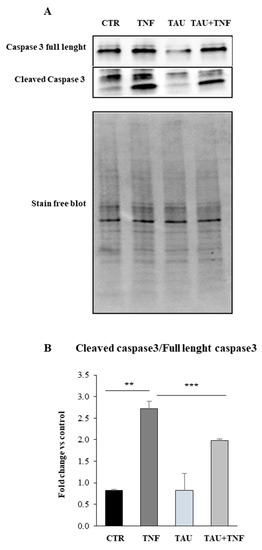 To this purpose, we treated L6 cells with taurine in the presence or the absence of TNF and we evaluated by Western Blot analysis the expression levels of caspase 3. As shown in Figure 5A,B, the increased levels of the cleaved isoform of caspase 3 detected in TNF treated cells is significantly decreased by taurine both in the presence and in the absence of TNF.