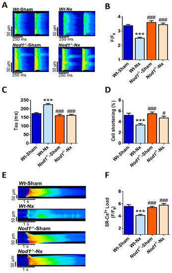 Deficiency of nucleotide-binding oligomerization domain-containing protein 1 (NOD1) prevents the dysregulation of systolic Ca2+ release, cell contraction impairment and the reduction in sarcoplasmic reticulum (SR) Ca2+-load triggered by 5/6 nephrectomy. (A) Representative line-scan confocal images of Ca2+ transients in cardiomyocytes from Wt-sham, Wt-Nx, Nod1−/−-sham and Nod1−/−-Nx mice electrically evoked by field stimulation at 2 Hz. Mean values of (B) peak fluorescence of Ca2+ transients, (C) decay time constant and (D) cell shortening obtained in cells from Wt-sham (n = 45 cells/five mice), Wt-Nx (n = 43 cells/five mice), Nod1−/−-sham (n = 39 cells/five mice) and Nod1−/−-Nx (n = 50 cells/five mice) mice. (E) Representative line-scan confocal images of caffeine-evoked Ca2+ transients in cardiomyocytes from all groups. (F) Mean values of caffeine-evoked Ca2+ transients amplitude obtained in cells from Wt-sham (n = 33 cells/five mice), Wt-Nx (n = 37 cells/five mice), Nod1−/−-sham (n = 34 cells/5 mice) and Nod1−/−-Nx (n = 35 cells/5 mice) mice. Results show mean ± SEM. *** p < 0.001 vs. Wt-sham; # p < 0.05, ### p < 0.001 vs. Wt-Nx.