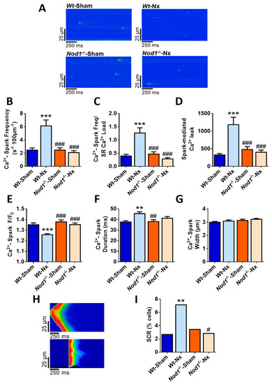 Prevents the increased frequency of Ca2+-sparks and spontaneous Ca2+ release (SCR) induced by 5/6 nephrectomy. (A) Representative line-scan confocal images of Ca2+ sparks recordings obtained in a quiescent cardiomyocyte isolated from Wt-sham, Wt-Nx, Nod1−/−-sham and Nod1−/−-Nx mice. Average data of (B) Ca2+ spark frequency, (C) normalization of Ca2+ spark frequency by SR-Ca2+ load, (D) spark-mediated Ca2+ leak and Ca2+ sparks properties: (E) peak, (F) duration and (G) width obtained in cells isolated from Wt-sham (n = 45 cells/five mice), Wt-Nx (n = 47 cells/five mice), Nod1−/−-sham (n = 40 cells/five mice) and Nod1−/−-Nx (n = 46 cells/five mice) mice. (H) Representative line-scan confocal images of SCR recordings (Ca2+ wave [upper panel]; spontaneous Ca2+ transients release (lower panel)) from cardiomyocytes isolated from Wt-Nx mice. (I) Average data of SCR occurrence obtained in cells isolated from all groups. Histograms show mean ± SEM. ** p < 0.01; *** p < 0.001 vs. Wt-sham; # p < 0.05; ## p < 0.01; ### p < 0.001 vs. Wt-Nx.