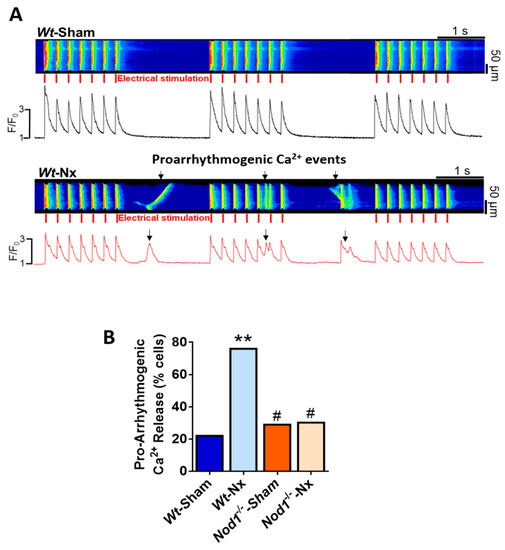 Deficiency of NOD1 prevents the increase of aberrant pro-arrhythmogenic Ca2+ events provoked by 5/6 nephrectomy. (A) Representative line-scan images of a cardiomyocyte paced at 2 Hz for three cycles isolated from Wt-sham (upper panel) and Wt-Nx mice (lower panel). The corresponding fluorescence [Ca2+]i profiles appear below line-scan images. Red marks indicate electrical stimulation. (B) Percentage of cells with pro-arrhythmogenic Ca2+ release in cells isolated from Wt-sham (n = 45 cells/5 mice), Wt-Nx (n = 47 cells/five mice), Nod1−/−-sham (n = 40 cells/five mice) and Nod1−/−-Nx (n = 46 cells/five mice) mice. Histograms show the mean values. ** p < 0.01 vs. Wt-sham; # p < 0.05 vs. Wt-Nx.