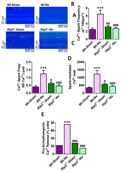 Deficiency of RIP2 prevents the increased frequency of Ca2+ sparks, diastolic Ca2+ leak and pro-arrhythmogenic Ca2+ events provoked by 5/6 nephrectomy. (A) Representative line-scan confocal images of Ca2+ sparks recordings obtained in a quiescent cardiomyocyte obtained from Wt-sham, Wt-Nx, Rip2−/−-sham and Rip2−/−-Nx. Average data of (B) Ca2+ spark frequency; (C) normalization of Ca2+ spark frequency by SR-Ca2+ load; (D) spark-mediated Ca2+ leak in cells isolated from Wt-sham (n = 35 cells/four mice), Wt-Nx (n = 38 cells/four mice), Rip2−/−-sham (n = 27 cells/four mice) and Rip2−/−-Nx (n = 47 cells/four mice) mice. (E) Percentage of cells with pro-arrhythmogenic Ca2+ release in cardiomyocytes isolated all groups. Histograms show mean ± SEM. *** p < 0.001 vs. Wt-sham; # p < 0.05; ## p < 0.01; ### p < 0.001 vs. Wt-Nx.