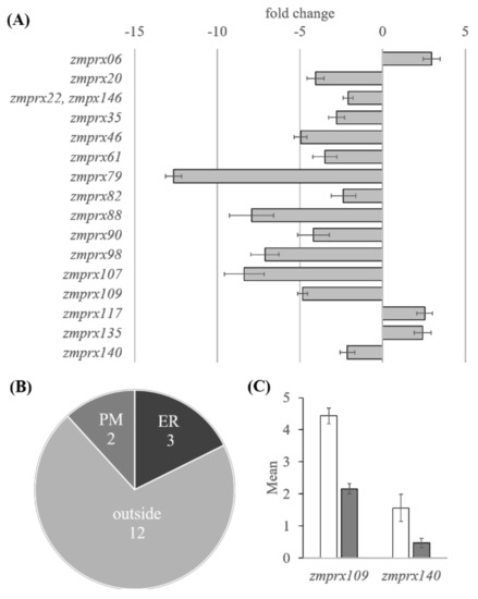 In the RNA Sequence (RNA Seq) analyses of control and stressed maize root samples, 152 Prx transcripts (135 genes) and 20 Rboh transcripts (11 genes) were identified. Pseudogenes were excluded from the analyses. Some of the peroxidases, catalogued by RedoxiBase database, could not be detected. This contains zmprx12, zmprx138, zmprx36, zmprx40, zmprx41, zmprx66, zmprx75, zmprx 01_W64A, zmprx100_35A19, zmprx108_35A19, zmprx03_Du101, zmprx03_F66, zmprx03_Lan496, zmprx03_W64A, and zmprx03_Wis93. The statistical analysis of the RNA Seq data revealed a significant upregulation of zmrboh10 and 17 differentially expressed class III peroxidase genes (DEGs), of which three were upregulated and 13 were downregulated based on 2-fold change and p-value of p < 0.05 of comparison pair (hypoxia versus control) (Figure 1A and Supplementary Materials Table S1A,B). In silico prediction of the 17 class III peroxidases showed localization in the endoplasmic reticulum (zmprx35, zmprx46, and zmprx135), the PM (zmprx109 and zmprx140), and “outside”, i.e., apoplast or cell wall (Figure 1B). The two PM predicted peroxidases, zmprx109 and zmprx140, were 2–5-fold downregulated in stressed maize plants (zmprx109 with mean of 2.16 ± 0.16 and zmprx140 with mean of 0.47 ± 0.15) compared to controls (zmprx109 with mean of 4.44 ± 0.24 and zmprx140 with mean of 1.56 ± 0.43) (Figure 1A,C).